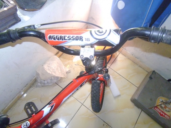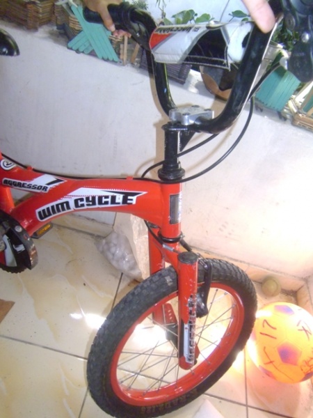 Sepeda BMX Wim Cycle Agresor 16". Sepeda second BMX Wim Cycle Agresor 16" warna merah mulus kokoh. Tulisan stiker sock depan rada mengelupas. Bonus roda keseimbangan bawaannya. Dijual karena yang pakai minta ganti sepeda yang lebih besar. Masih nyaman di pakai, hanya dipakai sekitar rumah. Kondisi lihat seperti gambar.